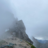 Das Wetter für den nächsten Tag sah nicht gut aus. Tiefe Wolken, hohe Regenwahrscheinlichkeit – nicht das beste Wetter für eine derartige Tour am Grat. Trotzdem starteten wir zur Karwendelbahn, um uns dort mit Tim, dem zweiten Ausbilder, zu treffen. Gleich mit der ersten Bahn ging es hinauf. Am Einstieg zum Klettersteig hingen noch tiefe Wolken, die sich dann schnell auflösten und uns einen perfekten Tag bescherten. Der Abend war geprägt von Theorie und Vorbereitung auf die am Mittwoch geplanten Lehrproben. Bau von Seilgeländern zwischen den Türgriffen in der Pension, Vorbereitung zur behelfsmäßigen Bergrettung und Erarbeitung des Schulungsablaufs.