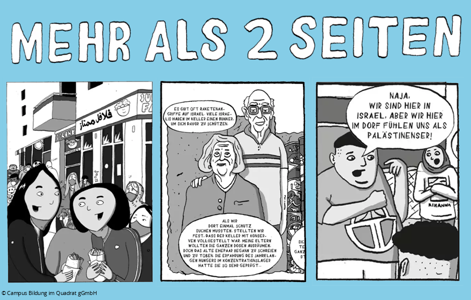 Mit diesen Worten beginnt ein Comic im Graphic-Novell Stil, das zu Recht viel öffentliche Aufmerksamkeit erhalten hat. Um Einblicke in eine für viele Schüler*innen spannende Region zu bekommen, organisierten zwei Lehrkräfte der Berliner Rütli-Schule eine Reise in den Nahen Osten. Der Comic, den die Schüler*innen gemeinsam mit ihren Lehrer*innen gestaltet haben, bringt persönliche Reiseerlebnisse mit geschichtlichen und gesellschaftlichen Hintergrundinformationen über den Nahen Osten zusammen. In sechs Kapiteln werden die Leser*innen mit nach Israel genommen, und zwischendurch selbst zum Nachdenken, Nachforschen und Nachmachen angeregt. Die zwei Hauptfiguren Heba und Narges teilen dabei ihre verschiedenen Erfahrungen, Fragen und Erkenntnisse der Reise.