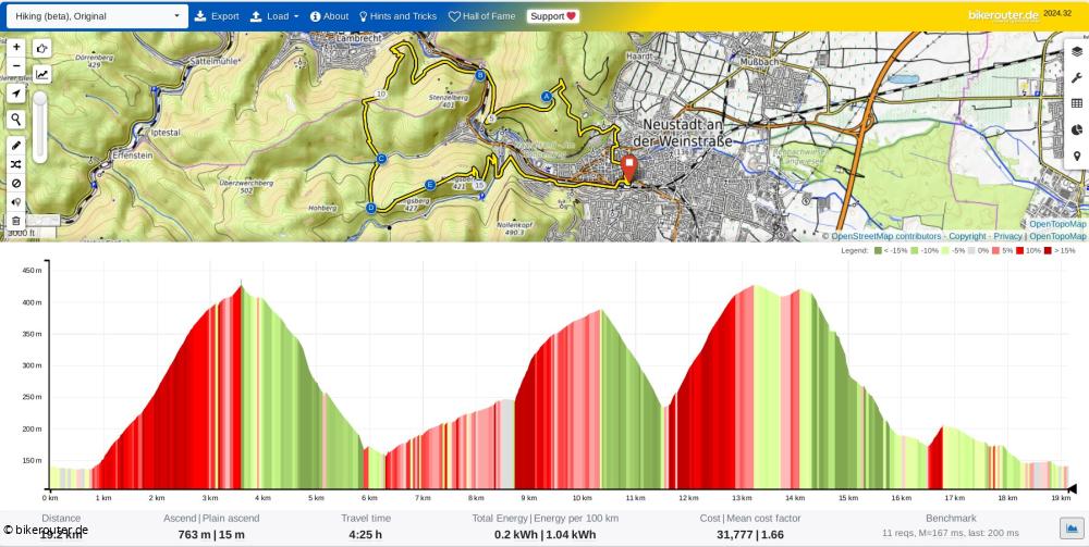 Die gesamte Wegzeit wird 6 Stunden betragen, mit Einkehr werden wir ca. 16:30 h am Bahnhof Neustadt an der Weinstraße ankommen.