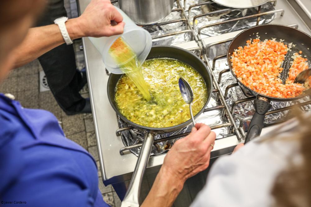 Zu Beginn der Kochschulung gab es einen kurzen Vortrag zu dem Projekt „Wassersparen durch bewussten Konsum“. Es wurde über den hohen Wasserverbrauch und über die Wasserverschmutzung bei der Produktion von Lebensmitteln sowie über Einsparmöglichkeiten von Wasser durch bewussten Lebensmitteleinsatz gesprochen.