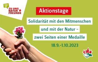 Am 16. September 1895 wurde die NaturFreunde-Bewegung gegründet – diesen Jahrestag möchten wir mit bundesweiten Aktionstagen feiern und unseren Verband noch bekannter machen. Vom 18.9.–1.10.2023 werden NaturFreund*innen in ganz Deutschland vielfältige öffentliche Veranstaltungen und Aktionen unter dem Motto „Solidarität mit den Mitmenschen und mit der Natur – zwei Seiten einer Medaille“ anbieten. Mach mit und plane selbst einen Aktionstag!