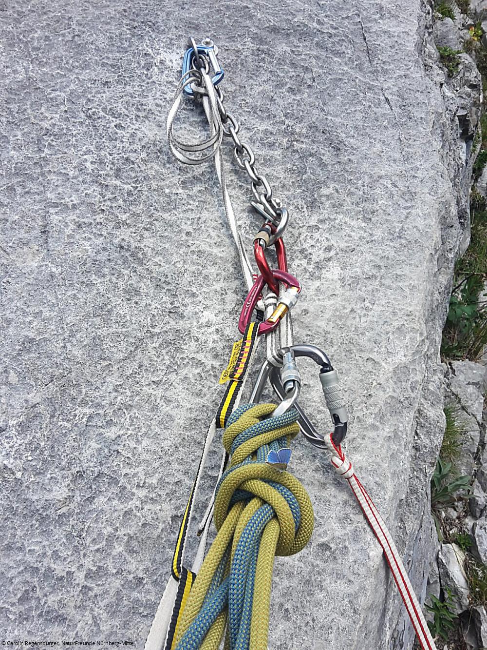 Am Montag ging es dann an den Fels. Im Klettergarten Flämenwandl wurde zunächst das Können der Teilnehmenden abgecheckt und anschließend fand direkt die erste Lehrprobe über die Knotenkunde statt. Durch zwei kurze Regenschauer unterbrochen, wurde danach der Standplatzbau in Angriff genommen.