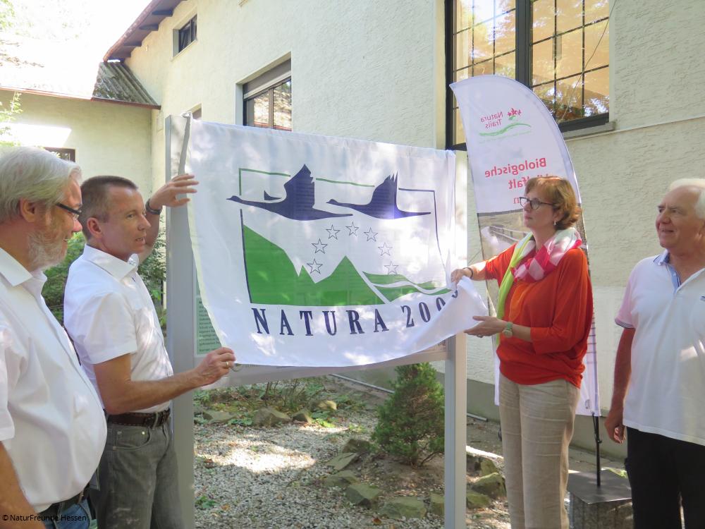 Die feierliche Eröffnung des Trails nahm danach Regierungspräsidentin Brigitte Lindscheid in Vertretung der Schirmherrin des Natura Trail-Projektes Staatsministerin Priska Hinz vor, in dem sie die am Naturfreundehaus neu aufgestellte Informationstafel enthüllte, die vorher durch ein Tuch mit Natura 2000-Logo bedeckt war. Die anschließende Teilbegehung führte zum Oberwaldberg, einem ehemaligen Müllberg, von dem man einen beeindruckenden Blick über das Natura 2000-Gebiet und das Rhein-Main-Gebiet hat.