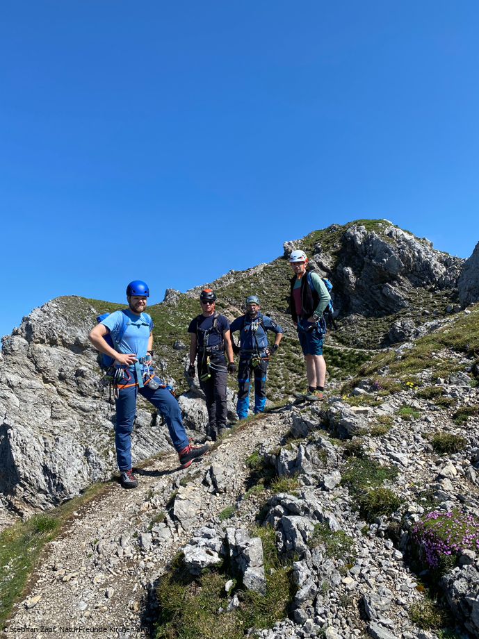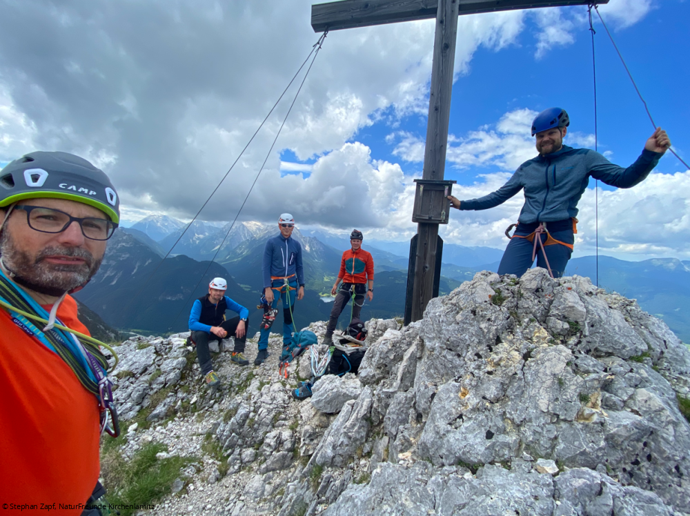 Am Freitag stand die Abschlusstour auf dem Programm: Der Südwestgrat der Viererspitze. 4 Seillängen im 3. Schwierigkeitsgrat mit der Schlüsselstelle 4+ direkt am Einstieg der Route. Start war wieder der Wanderparkplatz am Dammkar. Von dort ging es auf dem Wanderweg bis kurz unter die Mittenwalder Hütte. Dort zweigt der Weg links ins weglose Gelände ab. Wir suchten uns den Weg um die letzten Schneefelder bis in die Kreuzklamm. Dieser folgten wir bis zum Einstieg in den Südwestgrat. Die Einteilung der Seilschaften erfolgte schon am Vorabend, sodass wir schnell in der Route waren. Am Gipfel gab es dann eine kurze Brotzeit bevor wir den Abstieg zur Dammkarhütte nahmen. Nach der kräftezehrenden Tour kehrten wir noch beim nahe gelegenen Italiener ein und konnten den Abend mit dem Abschlussgespräch beenden.