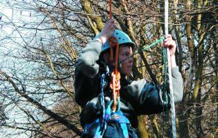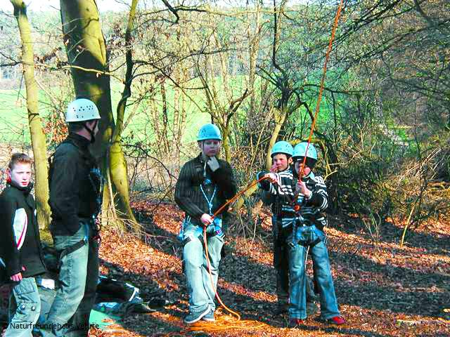 Baumklettern –mittels alpiner Bergrettungstechnik klettert ihr in die Höhe klettert (8–10 Meter), und sichert euch gegenseitig.